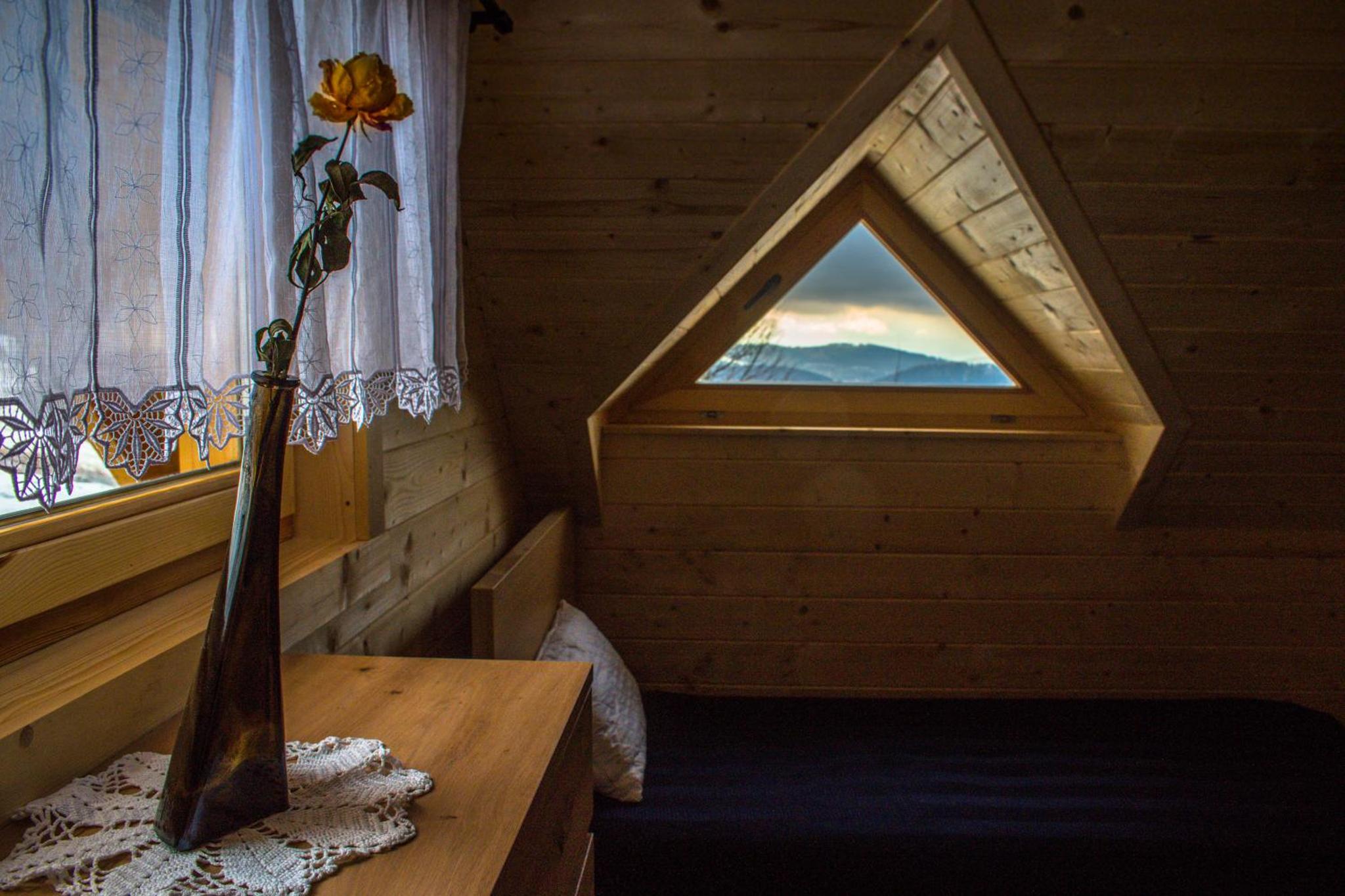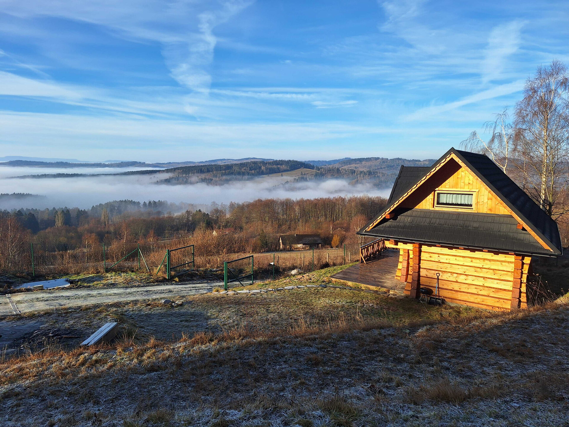 Nasze dwa domy to najbliżej położone zabudowania od wieży widokowej na Kalenicy (964 m.n.p.m). Znajdują się również w sąsiedztwie gór Stołowych, których pasmo widać za oknem.